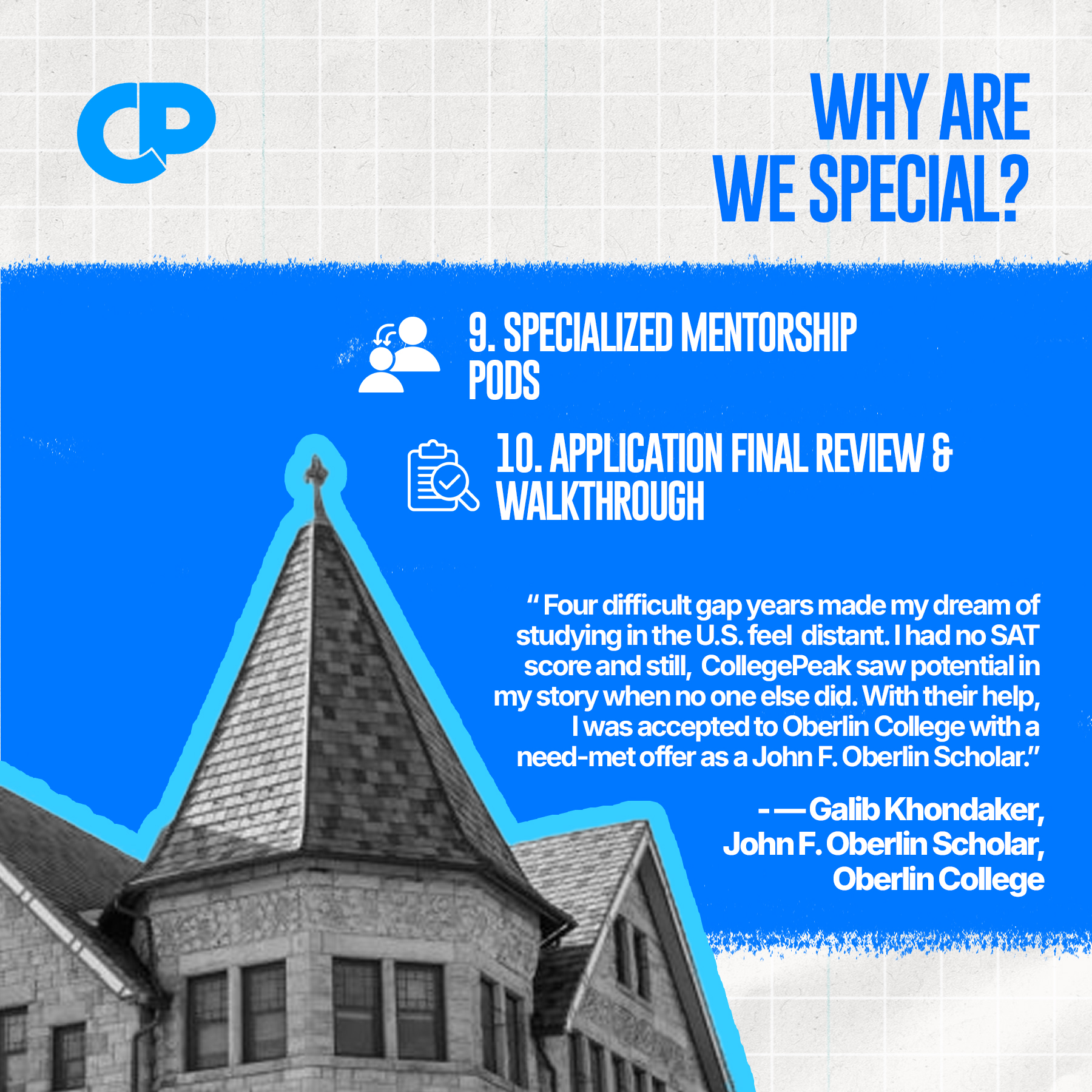 CollegePeak showed me that an SAT score isn't everything. Their guidance helped me highlight my strengths and build a powerful application. I got into amazing universities without stressing over standardized tests. Truly grateful for their strategic approach!